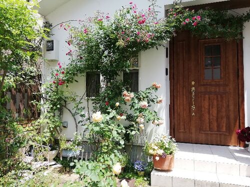 5月の庭です 4月はモッコウバラが主役の庭でしたが 濃いピンクのつるバラが咲きだして もうすぐ満開になりますよ このバラは いつもうまく咲いてくれなくて ハラハラするバラなんだけど 今年は虫もつかず きれいに枝を伸ばしてくれました 何十年も前に 太…